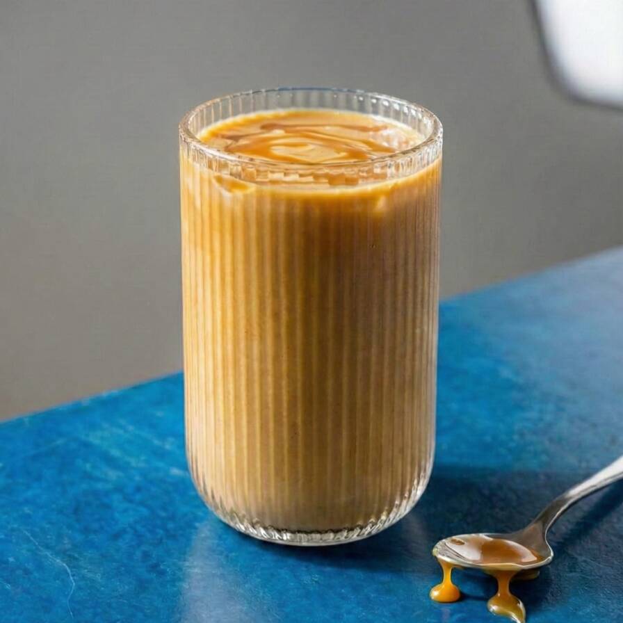 Caramelo, whey (24grs de proteína) sabor baunilha, banana congelada , e leite s/ lactose.