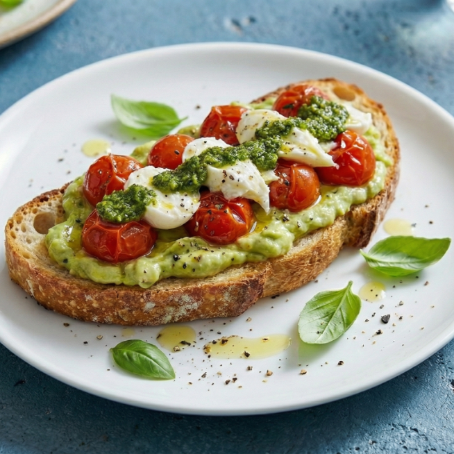 Pão de fermentação natural, pasta de abacate, tomate confit, muçarela bufula e pesto