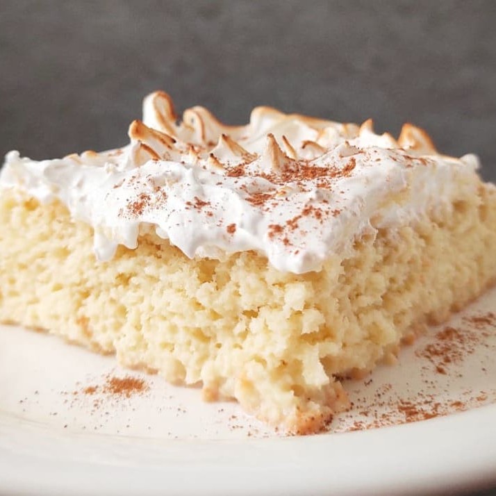 Delicioso bolo esponjoso de baunilha banhado em 3 tipos de leite: leite condensada, creme de leite e leite evaporada. Coberto com merengue suíço e um toque de canela em pó.