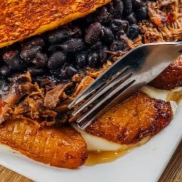 Consiste numa espécie de panqueca de uma textura macia e levemente adocicada, feita com milho moído ou processado e que logo passa numa chapa, o que a torna única em comparação com outras similares. Tradicionalmente, a cachapa é servida e untada com manteiga ou nata para realçar seu sabor e originalmente é recheada com um queijo branco fresco própio da nossa terra. Mas nós a serviremos com um queijo produzido especialmente pelo chef da casa que recria a essência dessa tradição, a nossa tradicional carne desfiada, feijão preto e banana da terra frita