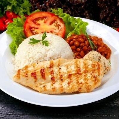 Marmitex grande irá acompanhando filé de frango grelhado com fritas, arroz, feijão, macarrão, batata frita e salada verde com tomate.