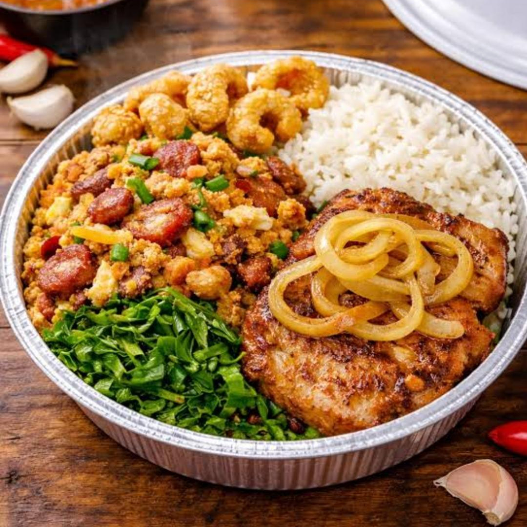 Marmita grande brasileira: costelinha com mandioca, arroz, feijão, macarrão, couve refogada, farofa salada.