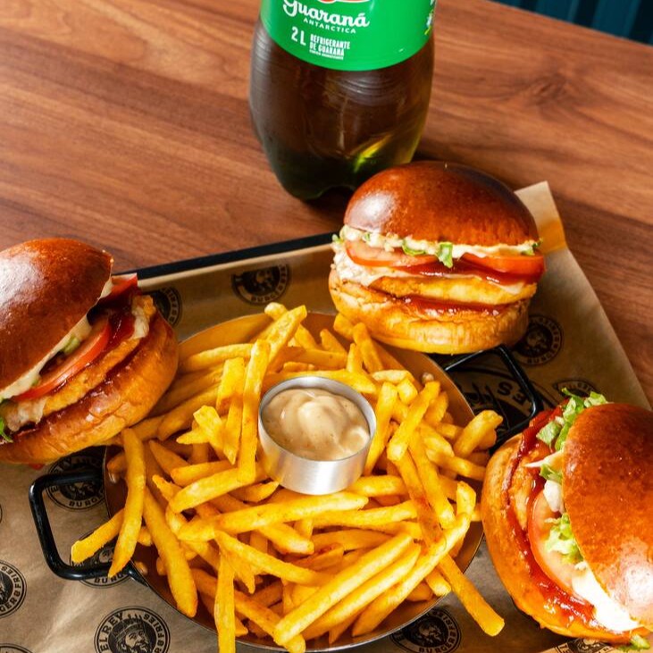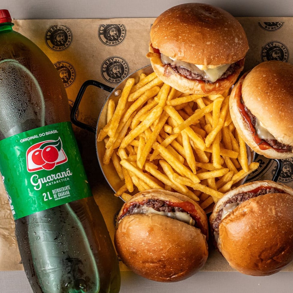 Desfrute de um delicioso combo para quatro pessoas, composto por 4 sanduíches de pão brioche recheados com queijo mussarela , blend bovino, molho Katchup e molho do Rey. Acompanha uma porção generosa de batata (450g) e uma refrescante Guarana de 2 litros. Uma explosão de sabores para compartilhar com a família e amigos.