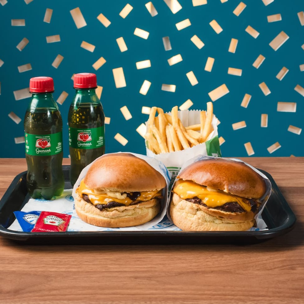 Um combo para casais que inclui dois suculentos sanduíches de blend bovino e queijo prato em pão brioche, uma porção de batatas crocantes (130g) e dois Guaranas de 200ml. Uma experiência gastronômica perfeita para compartilhar.