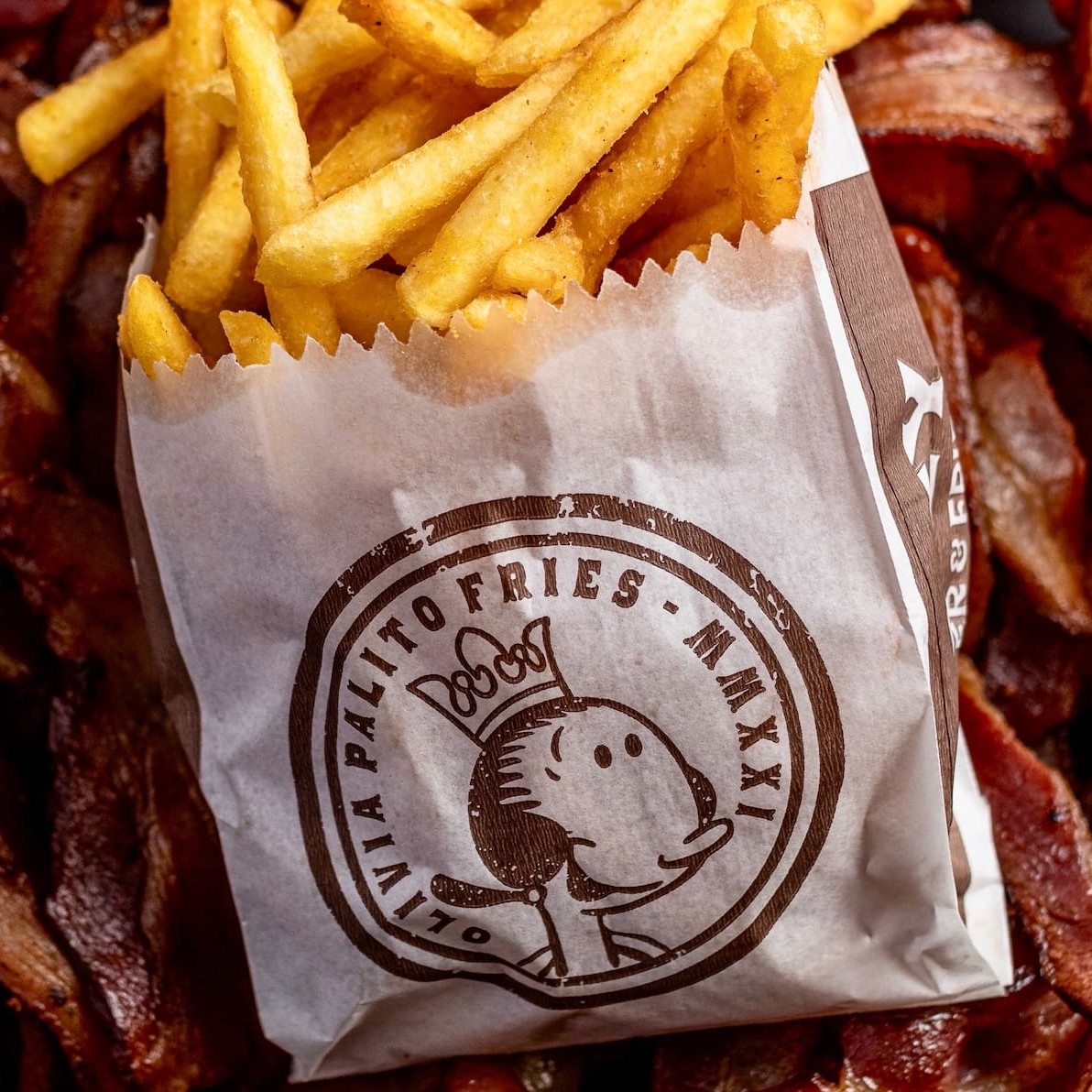 Pão de brioche tostado, Blend bovino 130g, duplo bacon , cheddar cremoso, farofa de bacon, molho de alho defumado e ketchup, batata Olivia e refrigerante 200ml
