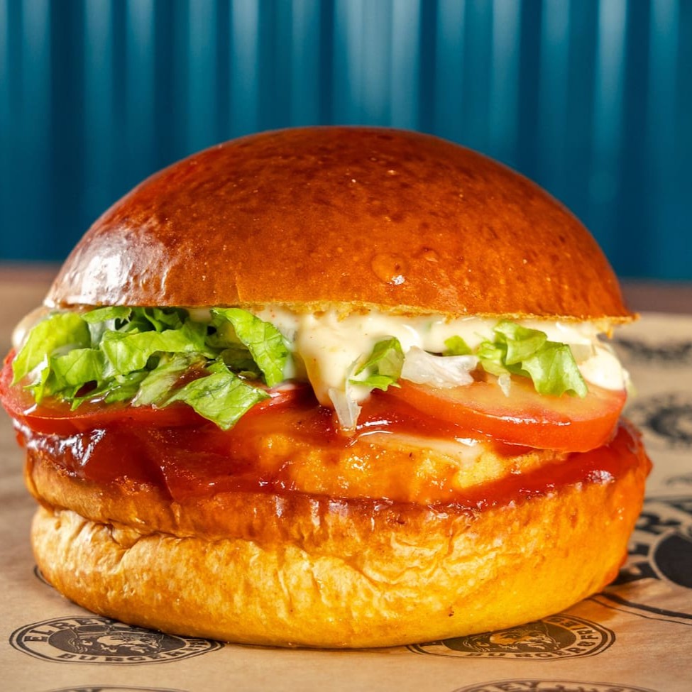 Pão de brioche tostado, chicken supremo 100g , mussarela, ketchup de goiaba, molho de alho defumado, alface e tomate.