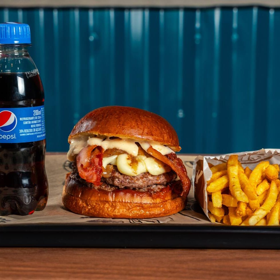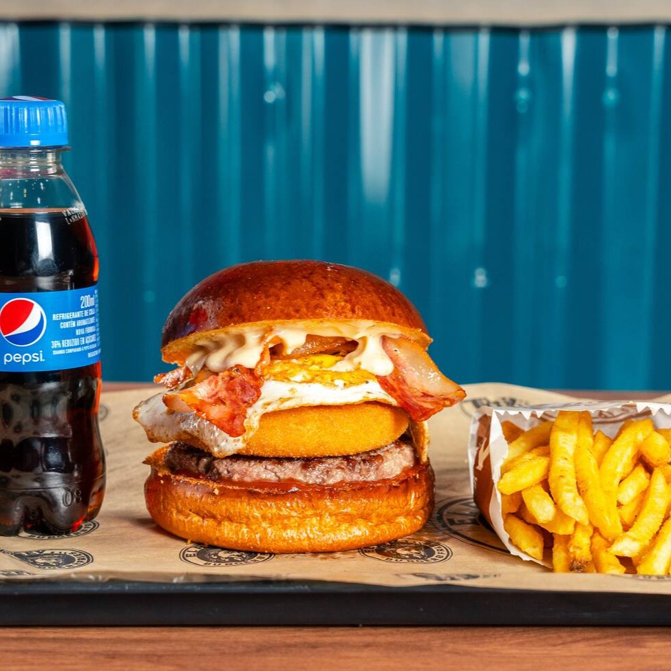 Pão de brioche tostado, Blend bovino 130g, queijo minas empanado 100g, duplo bacon, ovo, molho de alho defumado, ketchup, batata olivia e refrigerante 200ml
