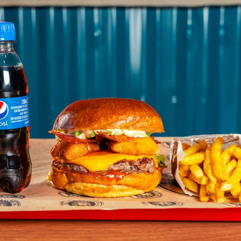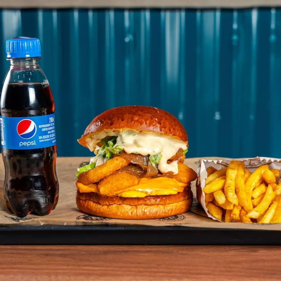 Pão de brioche tostado, Blend bovino 130g, duplo bacon , cream cheese, duplo onion rings, molho de alho defumado e ketchup, batata olivia e refrigerante 200ml.