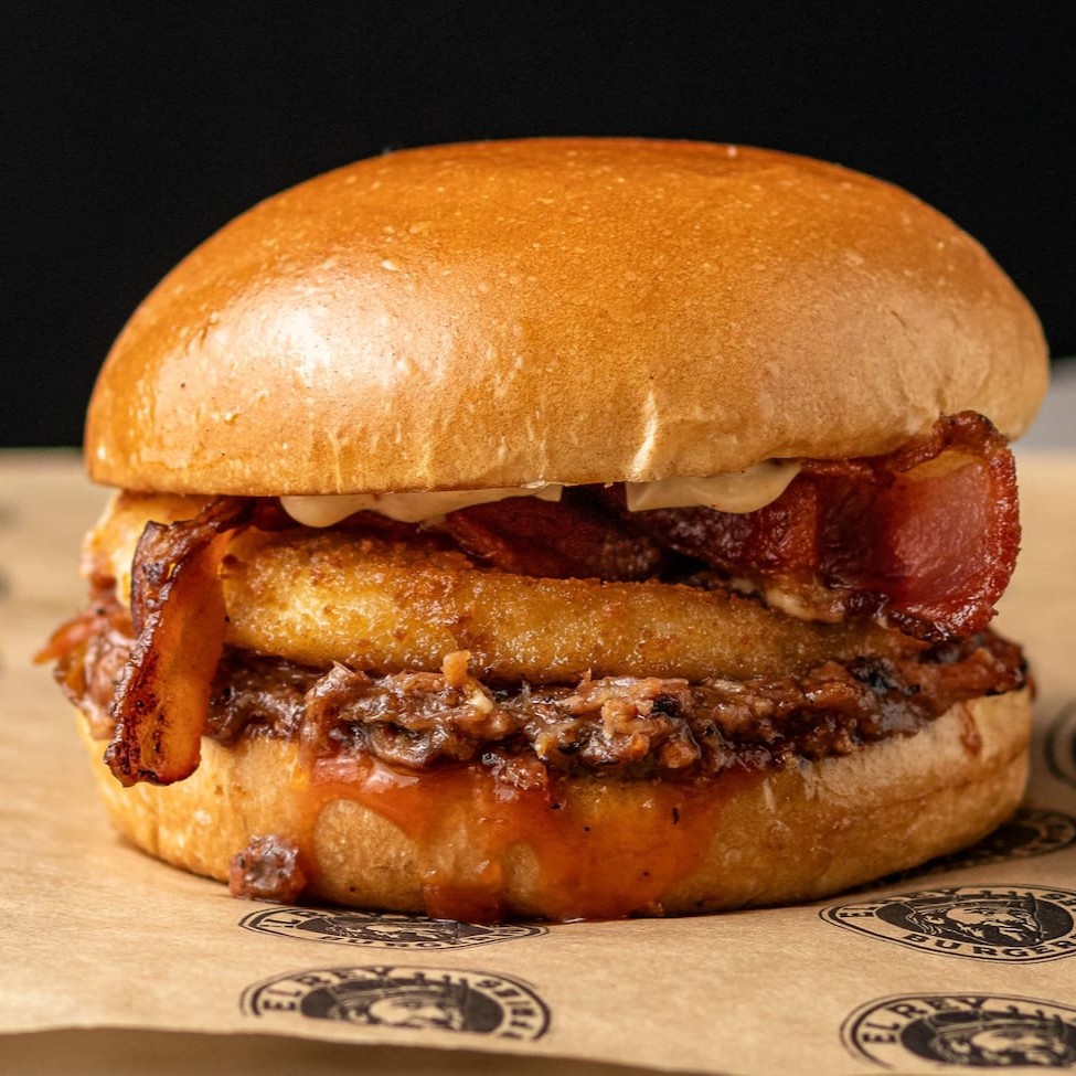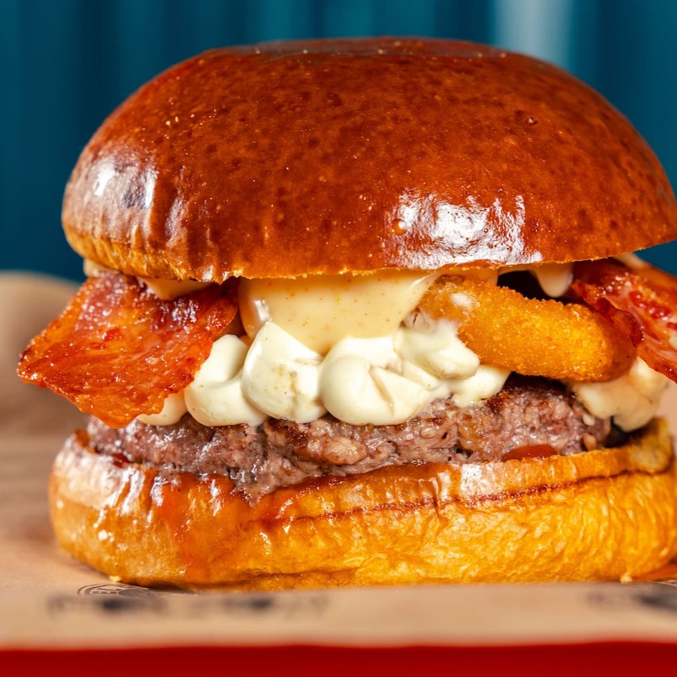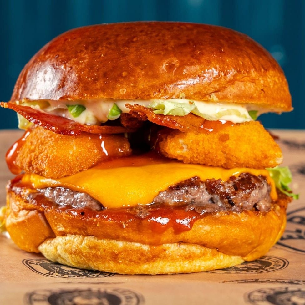 Pão de brioche tostado, Blend bovino 130g, duplo bacon , cream cheese, duplo onion rings, molho de alho defumado e ketchup.