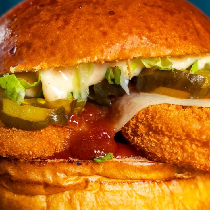 Pão de brioche tostado, duplo peito de frango empanado frito e picado, duplo ( 2 ) mussarela derretida, ketchup de goiaba, picles, molho de alho defumado, alface.