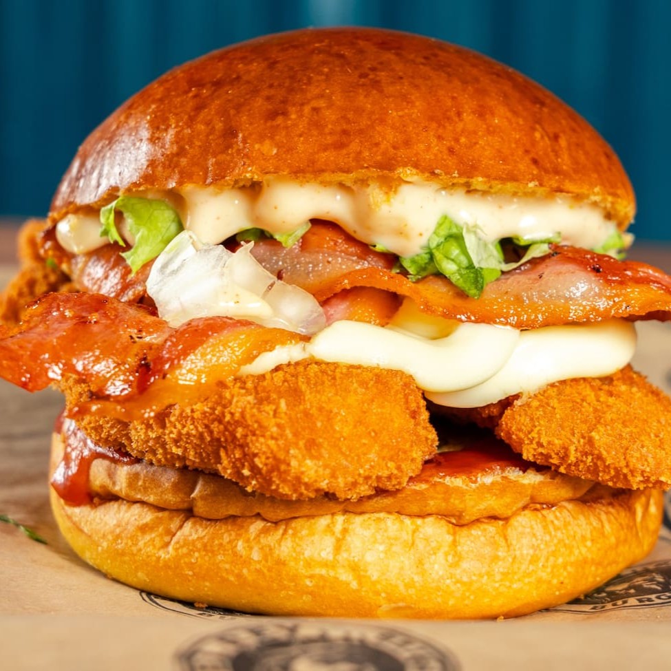 Pão de brioche tostado, duplo peito de frango empanado frito e picado, Catupiry Original, duplo ( 2 )bacon, molho defumado de alho, ketchup e alface.
