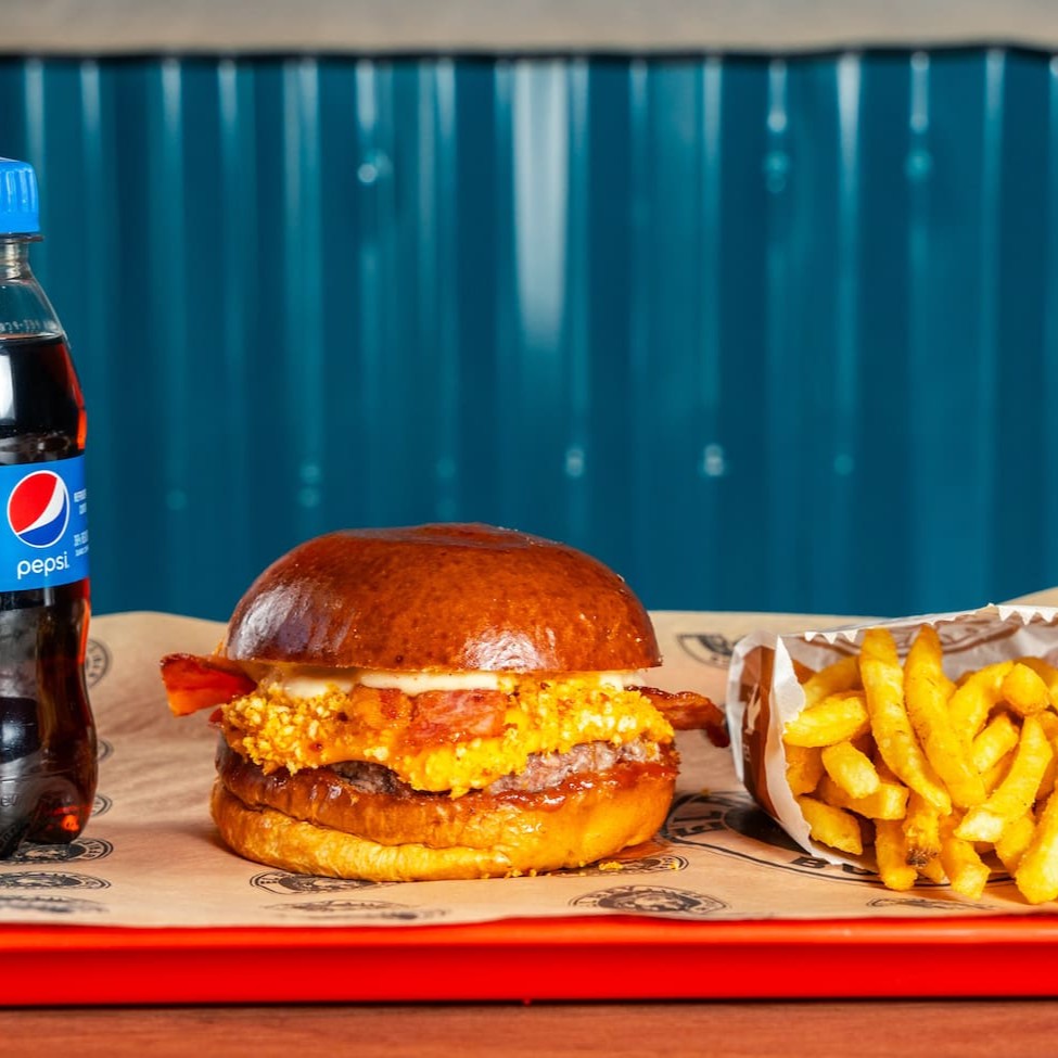 Pão de brioche tostado, Blend bovino 130g, queijo prato derretido, triplo (3) almofada de queijo gouda empanado, duplo bacon, molho Thai Sweet Chili oriental, ketchup e alface, batata olivia e refrigerante 200ml. l