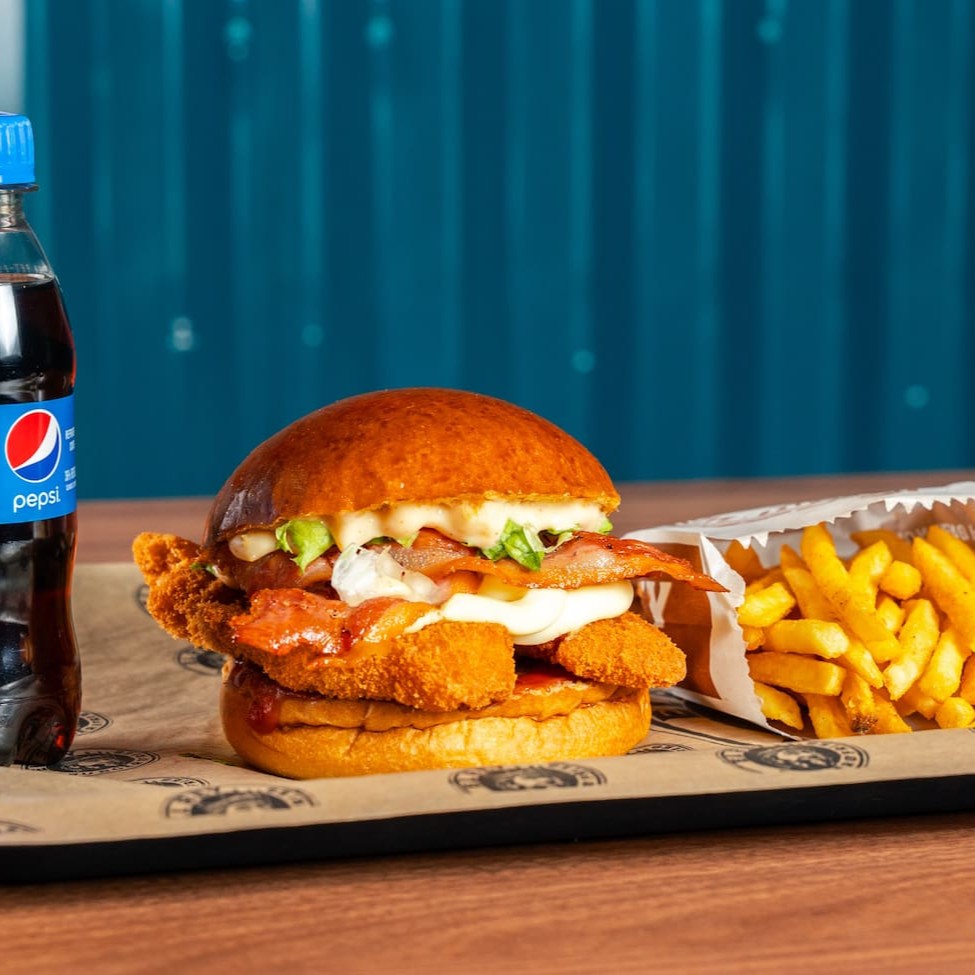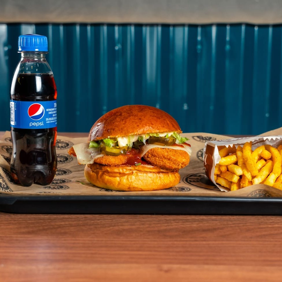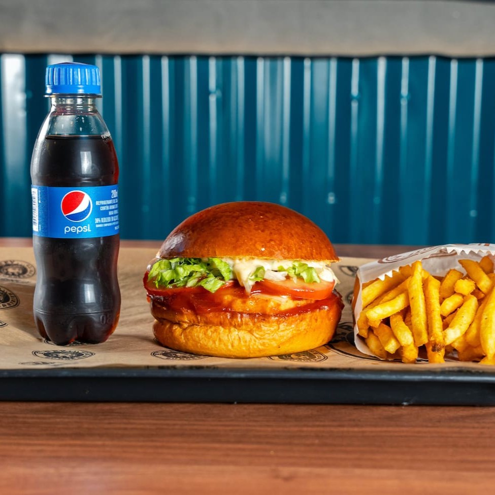 Pão de brioche tostado, Chicken supremo 100g , queijo mussarela empanado 100g, molho de alho defumado , ketchup e alface, batata Olivia e refrigerante 200ml.