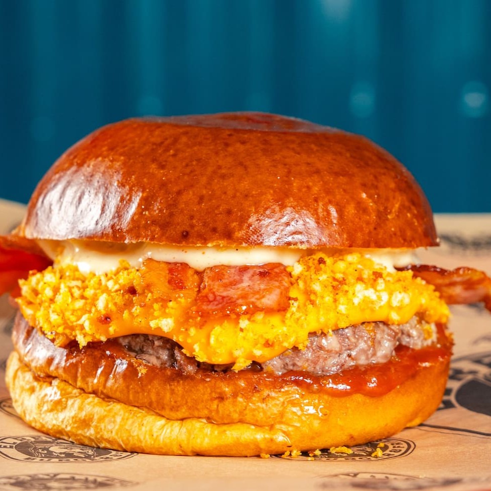 Pão de brioche tostado, Blend bovino 130g, queijo prato derretido, triplo (3) almofada de queijo gouda empanado, duplo bacon, molho Thai Sweet Chili oriental, ketchup e alface.