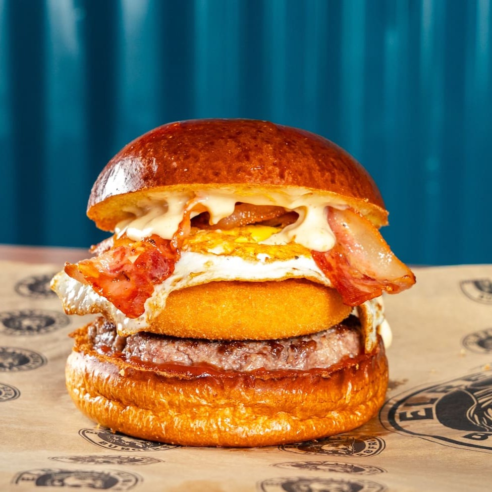 Pão de brioche tostado, Blend bovino 130g, queijo minas empanado 100g, duplo bacon, ovo, molho de alho defumado, ketchup