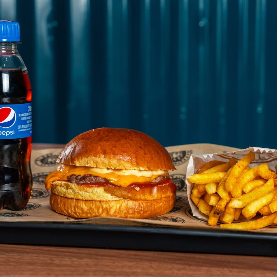 Pão de brioche selado, Blend bovino 100g, duplo queijo prato derretido, molho de alho defumado, ketchup, batata olivia e refrigerante 200ml