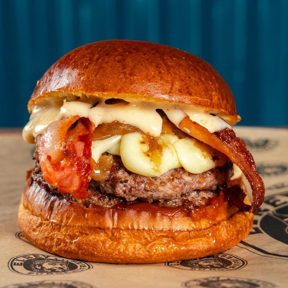 Pão de brioche tostado, Blend bovino 130g, duplo bacon , cheddar cremoso, farofa de bacon, molho de alho defumado e ketchup.