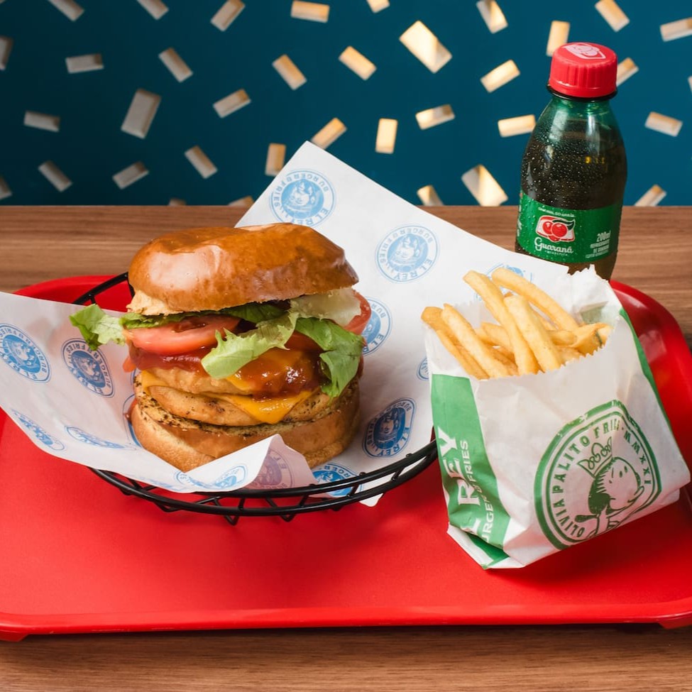 Pão de brioche tostado, duplo peito de frango empanado frito e picado, duplo ( 2 ) mussarela derretida, ketchup de goiaba, picles, molho de alho defumado, alface, batata Olivia e refrigerante 200ml .