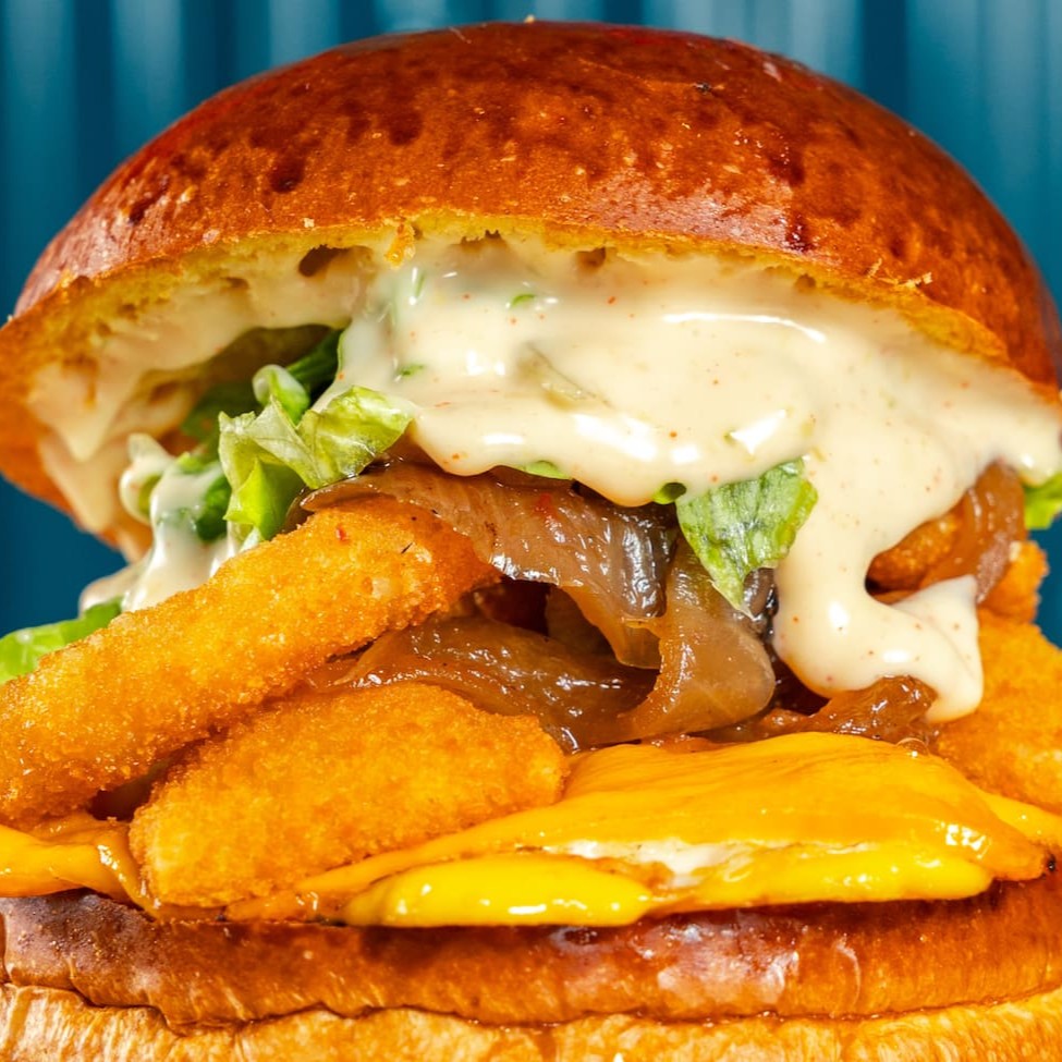 Pão de brioche tostado, ovo, queijo prato derretido, triplo (3) almofadas de queijo gouda empanado, cebola caramelizada, duplo ( 2) onion rigns, alface e molho de alho defumado e ketchup.