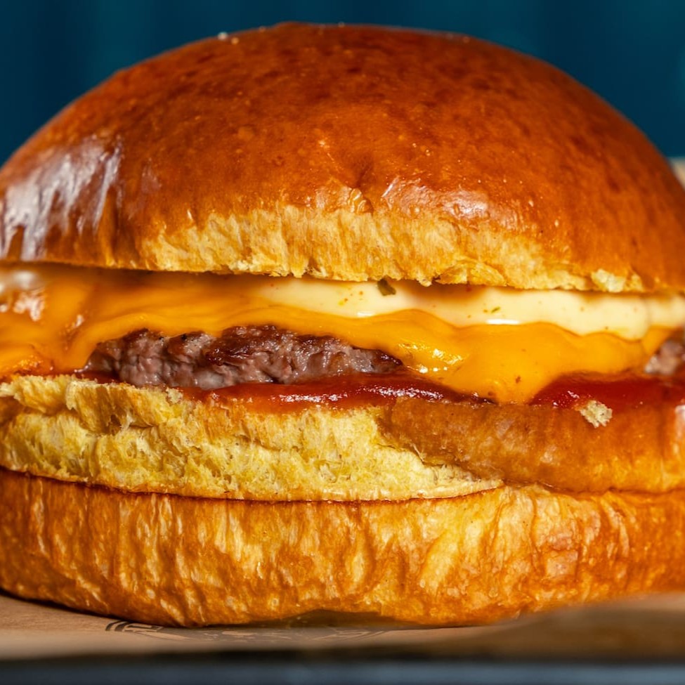 Pão de brioche selado, Blend bovino 100g, duplo queijo Mussarela derretido, molho de alho defumado, ketchup
