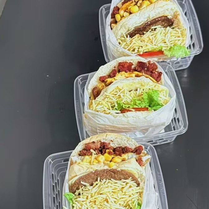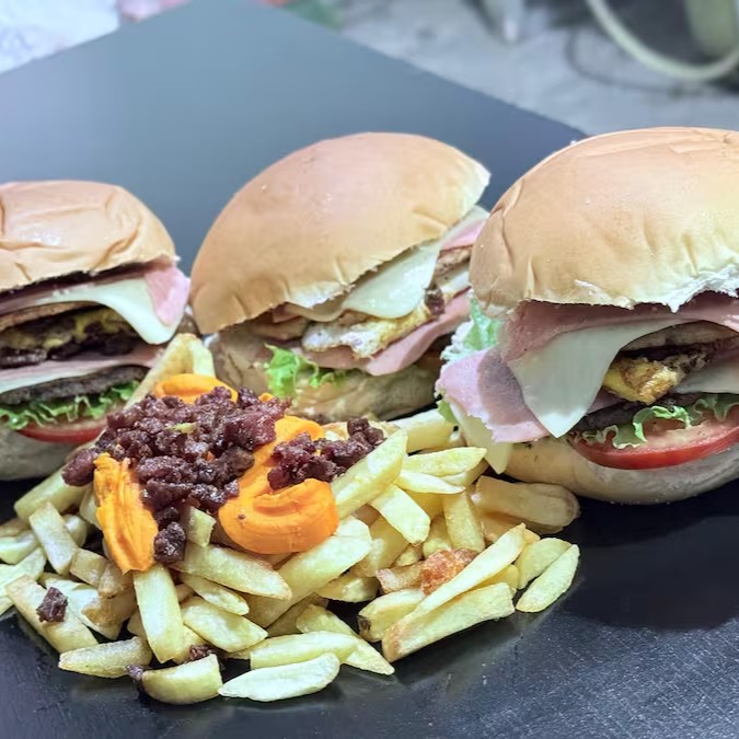 3 Burguers com Pão, Hambúrguer Bovino, Queijo, Ovo, Bacon, Milho, Batata Palha, Salada de Alface e Tomate e o Molho da Casa.