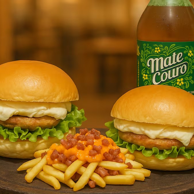 2 Hambúrgueres + Fritas + 1 Mate Couro 1 Litro