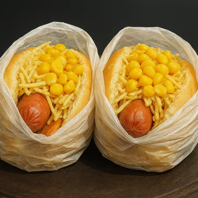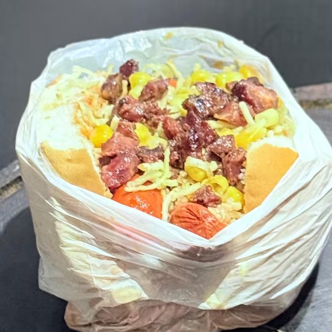 Pão, Quatro Salchichas, Muçarela, Presunto, Calabresa, Bacon, Frango Desfiado Catupiry, Cheddar, Milho, Batata Palha e Molho da Casa.