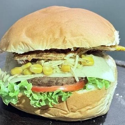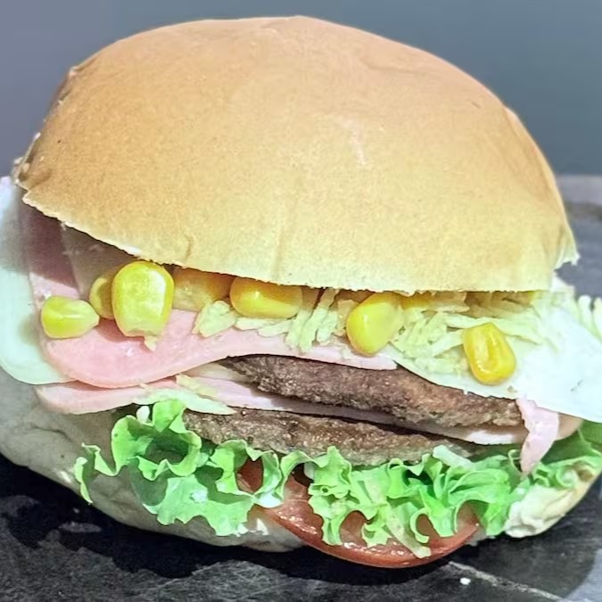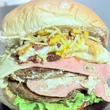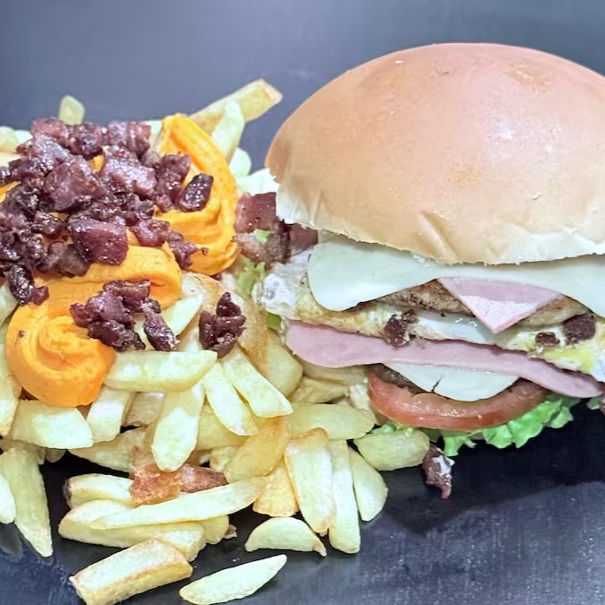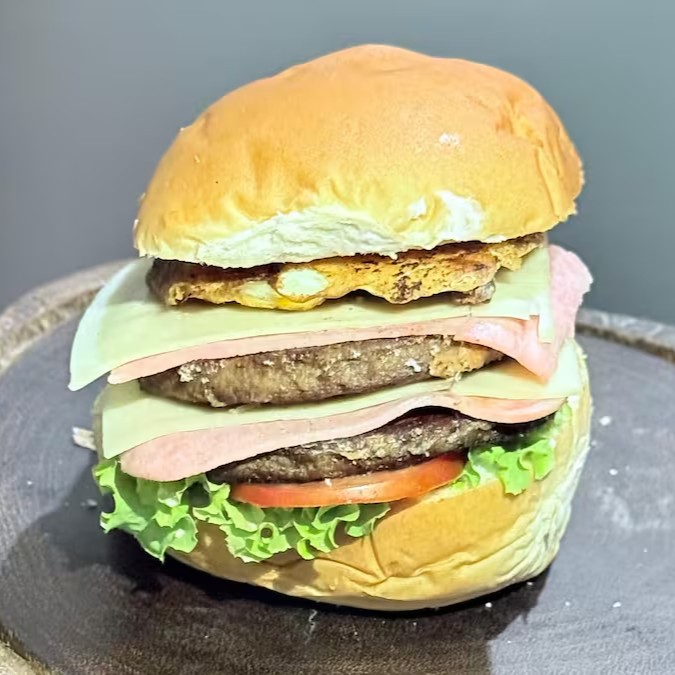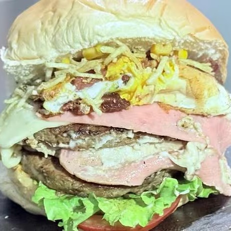 Pão, 2 Hambúrgueres Bovinos, Presunto em Dobro, Mussarela em Dobro, Milho, Batata Palha, Salada de Alface e Tomate e Molho da Casa.