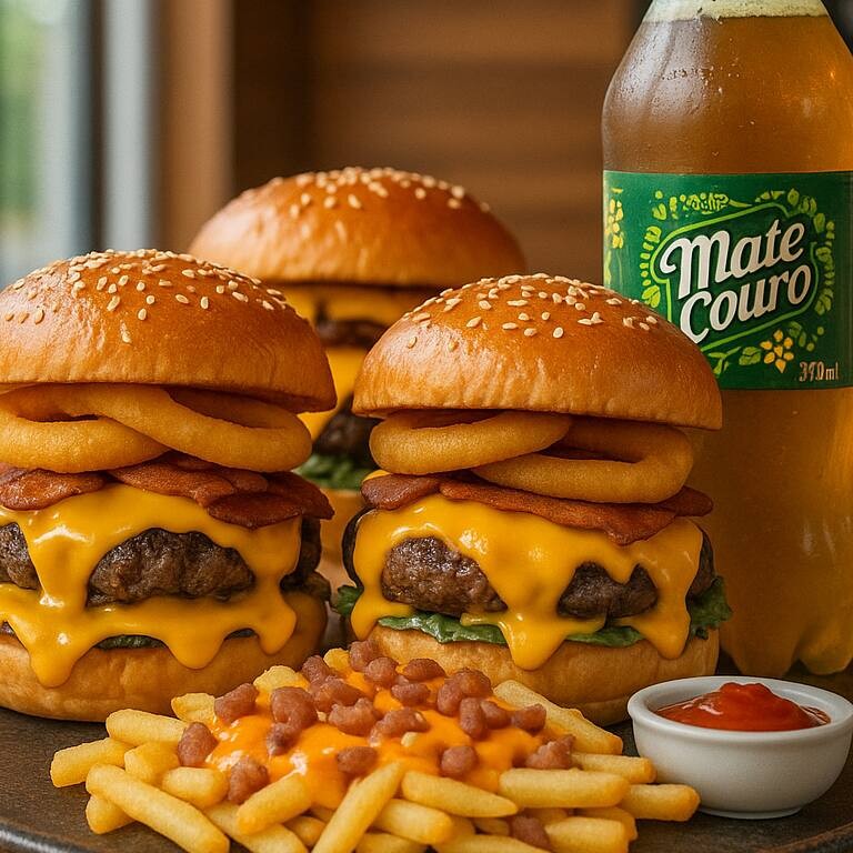 Acompanha uma Porção de Fritas com Bacon e Cheddar + 1 Mate Couro de 1 Litro