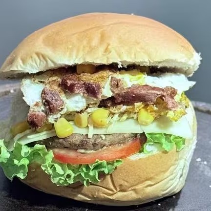 Pão, Hambúrguer Bovino, Mussarela, Ovo, Milho, Batata Palha, Salada de Alface e Tomate e o Molho da Casa.