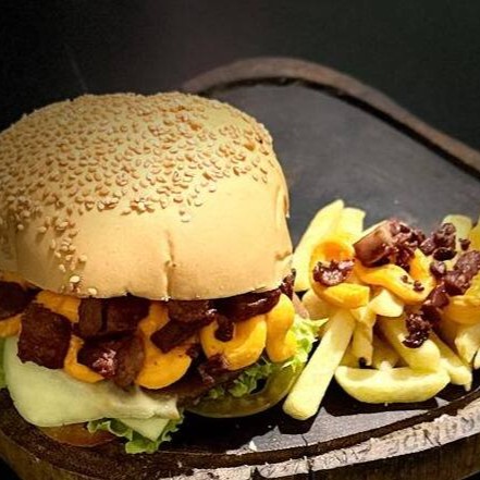 Pão de SELADO, 1 Carne Muito Saborosa de 120g, 3x Mais Mussarela, Cheddar, Bacon, Anel de Cebola, Tomate, Alface, Maionese Defumada e o Molho da Casa.Acompanha 100g de Batata Frita.