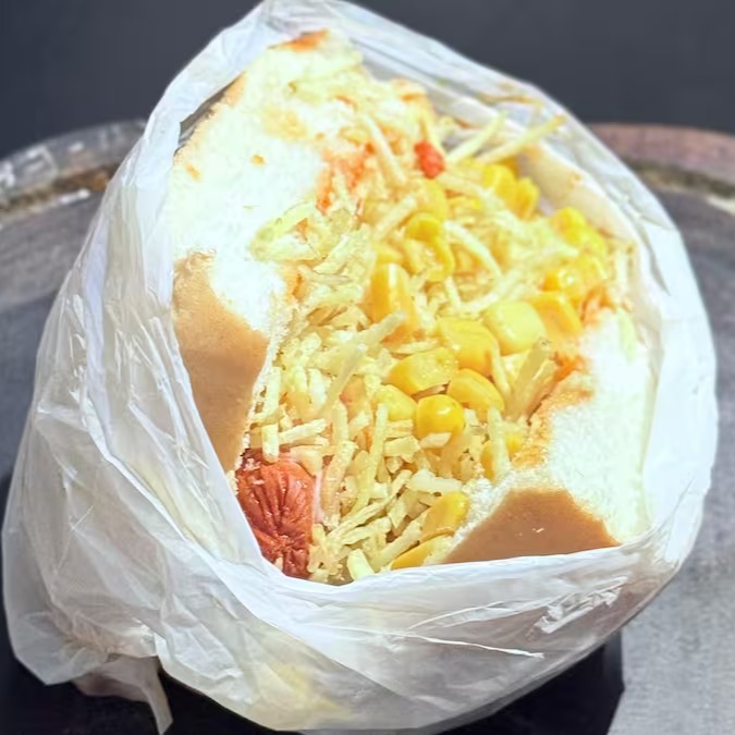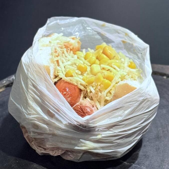 Pão, Salsicha, Queijo, Batata Palha, Milho e Molho da Casa.
