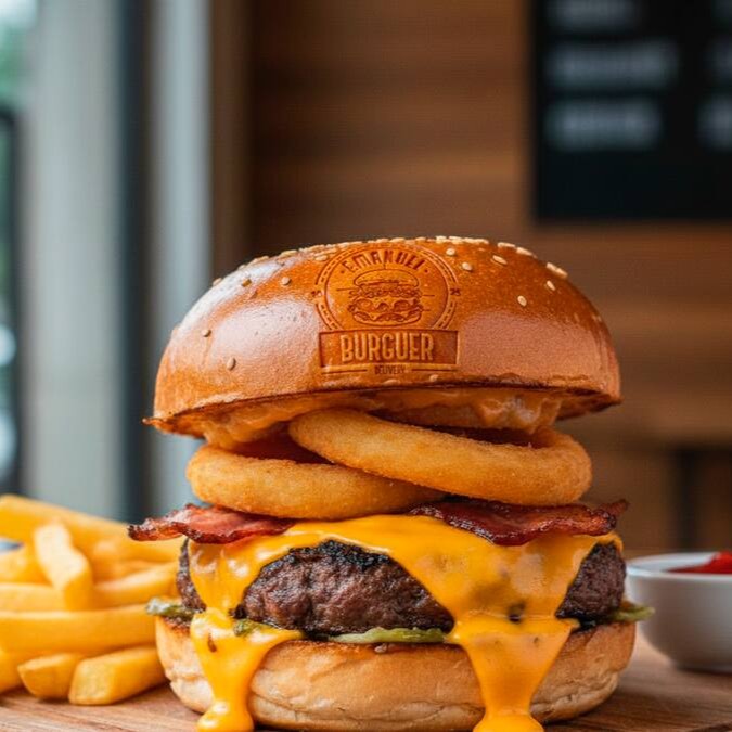 Pão de SELADO , 2 Carnes Muito Saborosas de 120g, 3x Mais Mussarela, Cheddar, Bacon, Anel de Cebola, Tomate, Alface, Maionese Defumada e o Molho da Casa.Acompanha 100g de Batata Frita.
