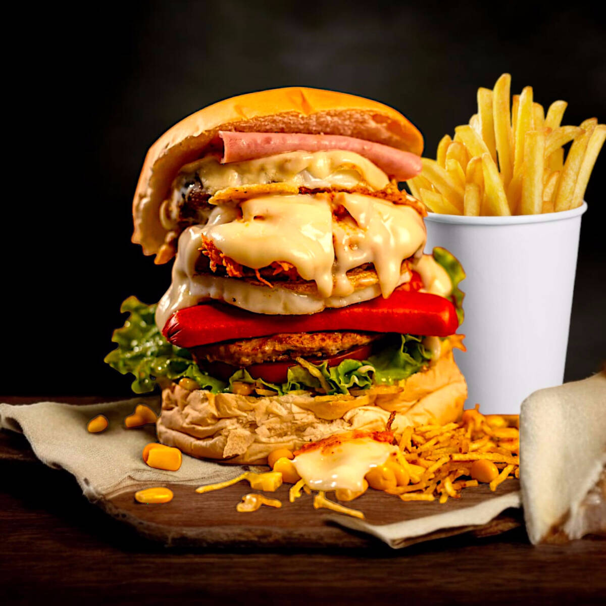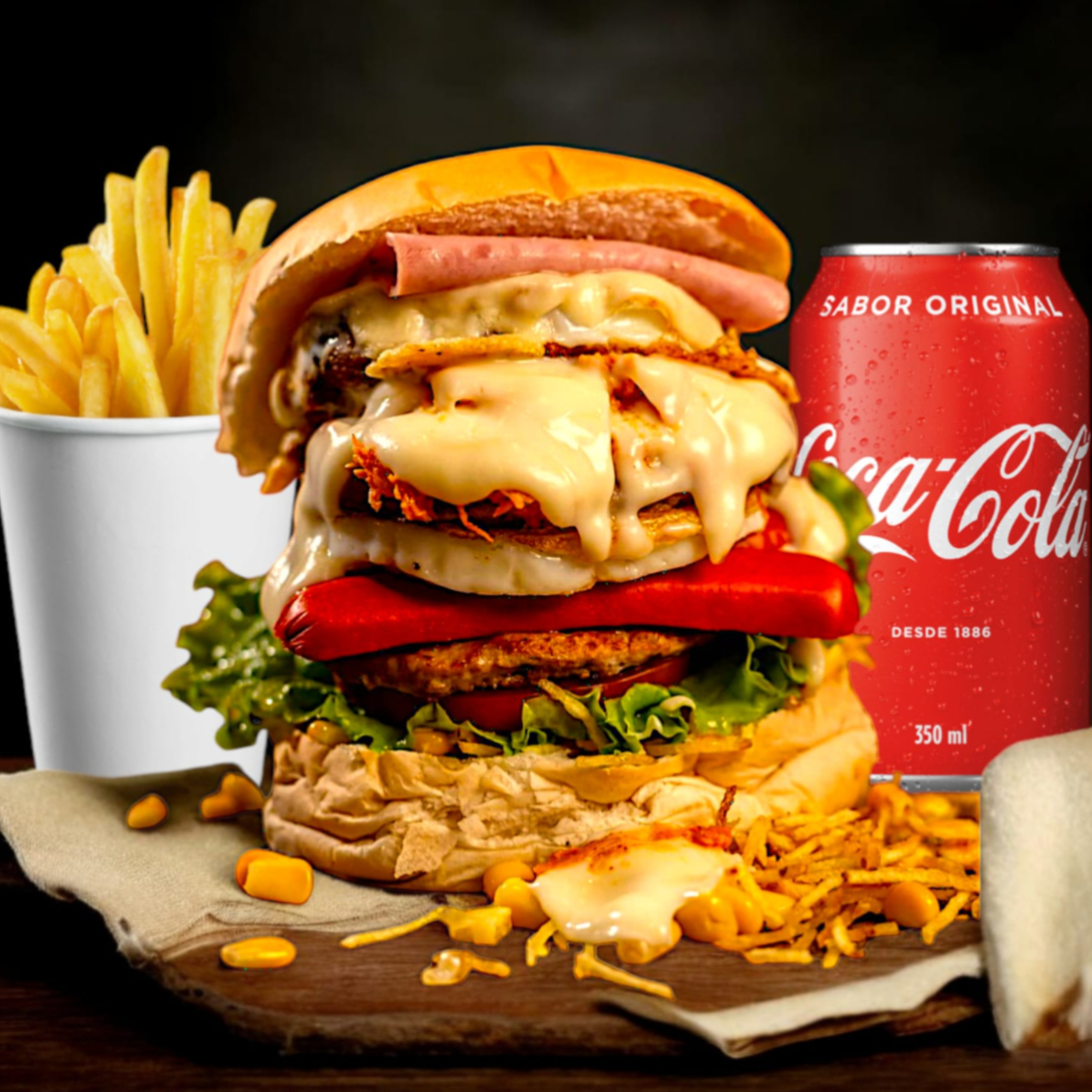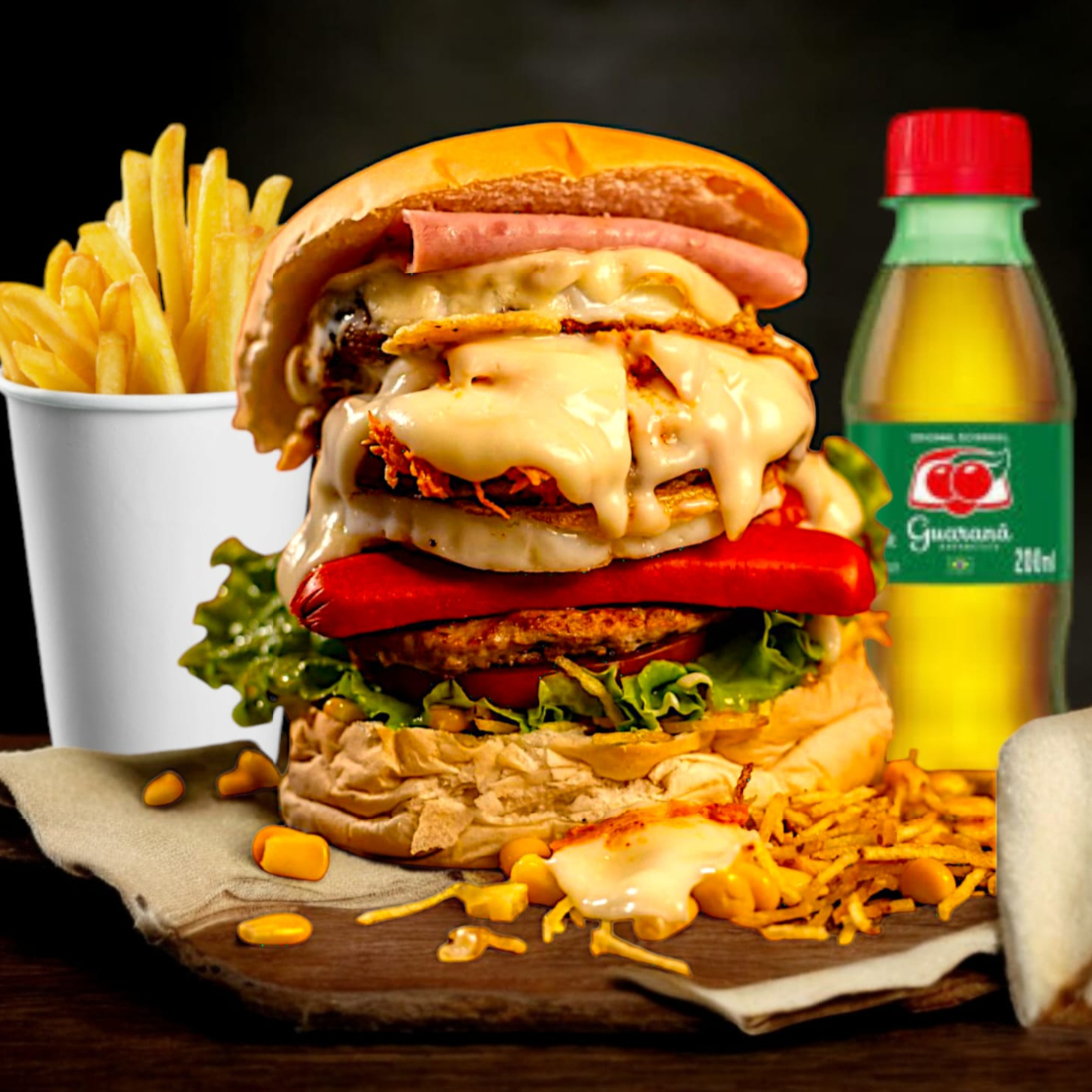 Experimente nosso irresistível Mega Hambúrguer com pão brioche artesanal, hambúrguer suculento, queijo derretido, presunto, bacon crocante, ovo frito, salsicha, milho, batata palha e maionese de alho. Acompanha batata frita e refrigerante gelado. Uma explosão de sabores em cada mordida!
