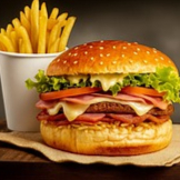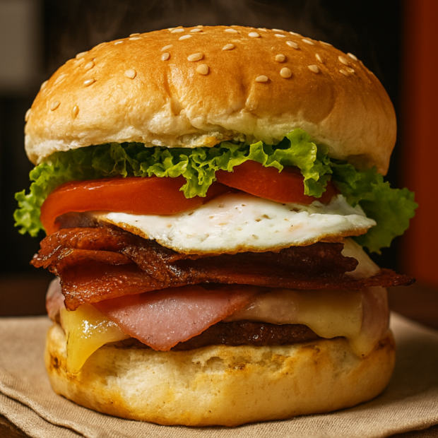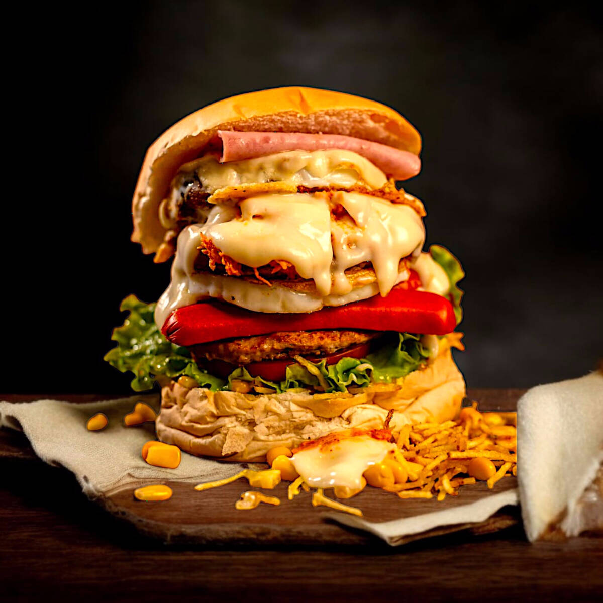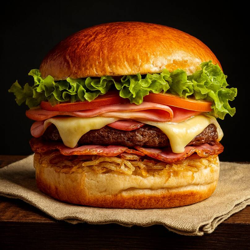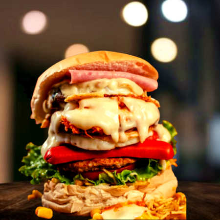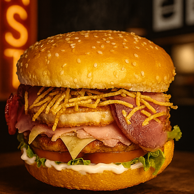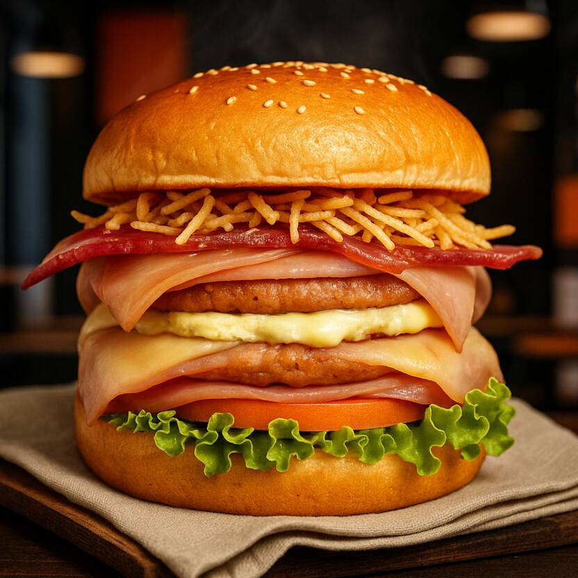 Experimente nosso irresistível Mega Hambúrguer com pão brioche artesanal, hambúrguer suculento, queijo derretido, presunto, bacon crocante, ovo frito, salsicha, milho, batata palha e maionese de alho. Acompanha batata frita e refrigerante gelado. Uma explosão de sabores em cada mordida!