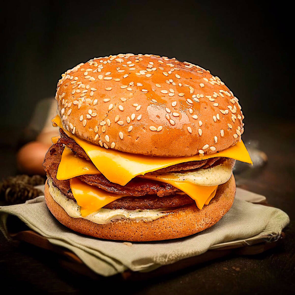 Apresentamos o Emi's Egg Bacon: um irresistível hambúrguer com pão brioche, alface, tomate, hambúrguer, queijo muçarela, presunto, ovo, o dobro de bacon e maionese de alho.