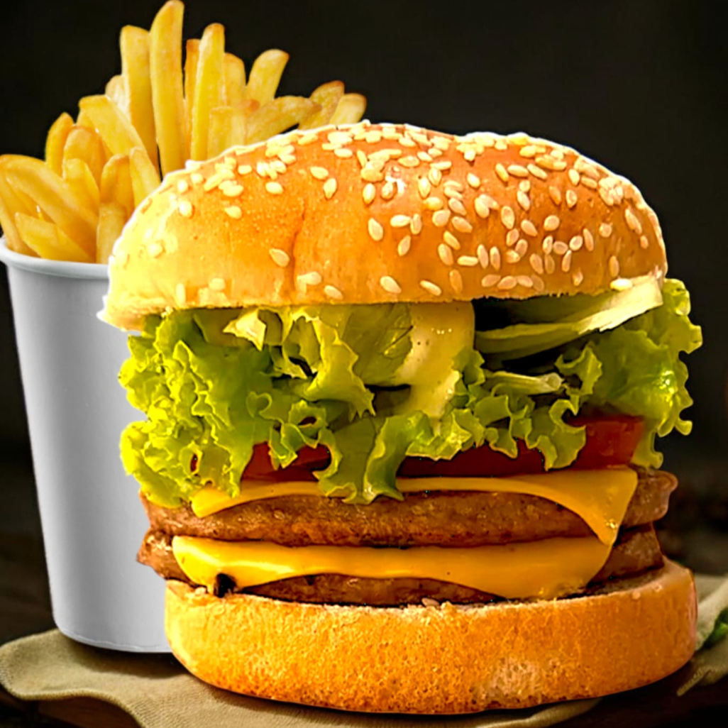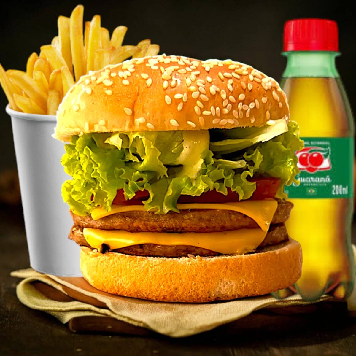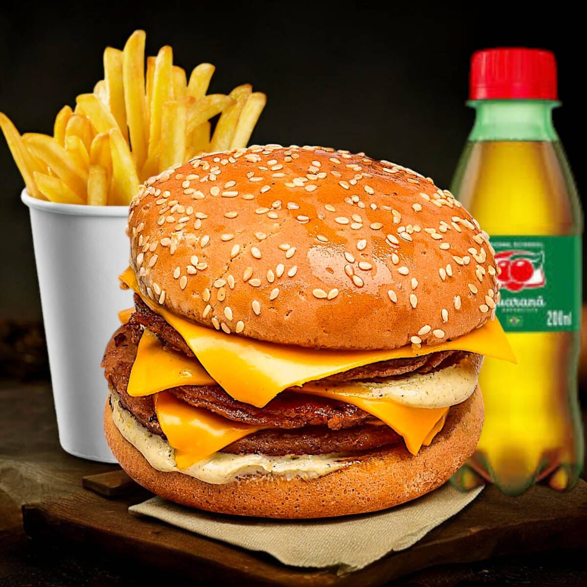 O dobro de tudo: Cheddar derretido, dois bifes grelhados, alface, tomate e a maionese de alho da casa. Uma explosão de sabor que você precisa experimentar + uma porção generosa de Fritas + Refrigerante