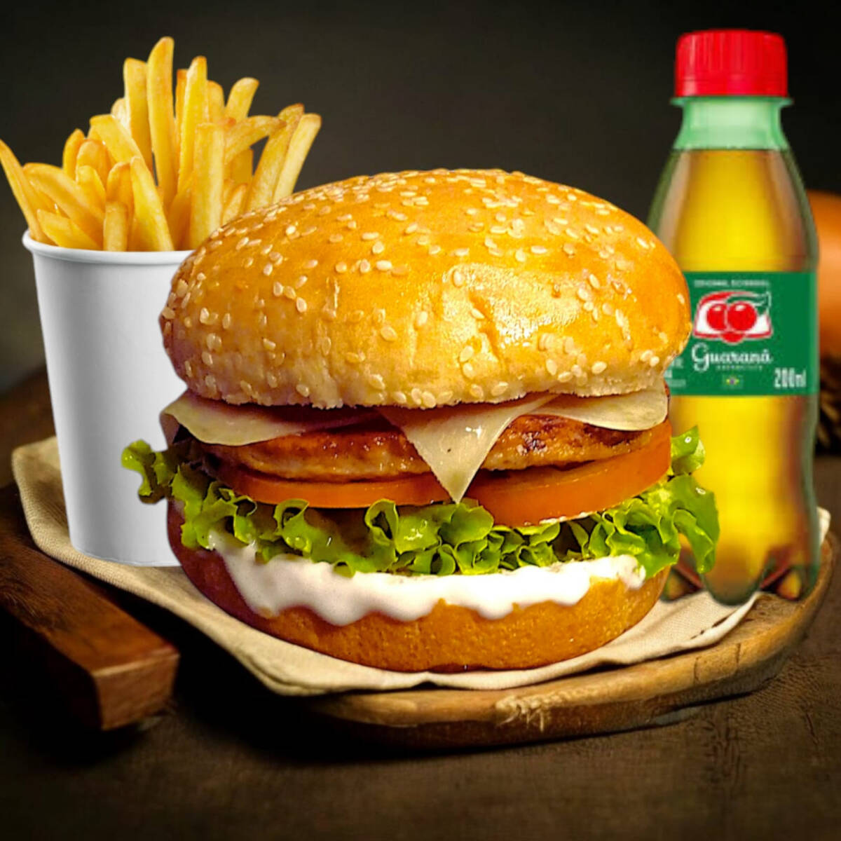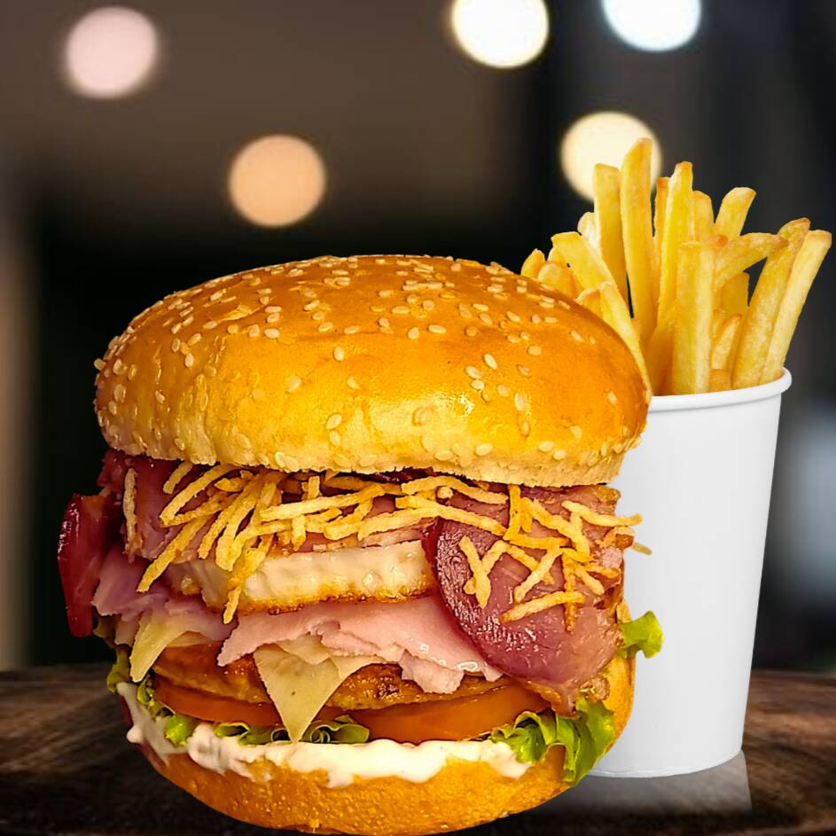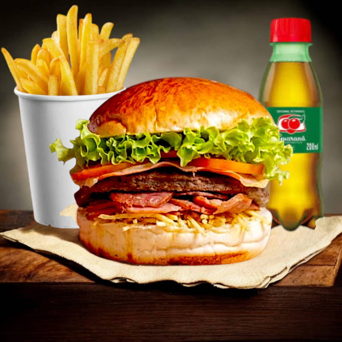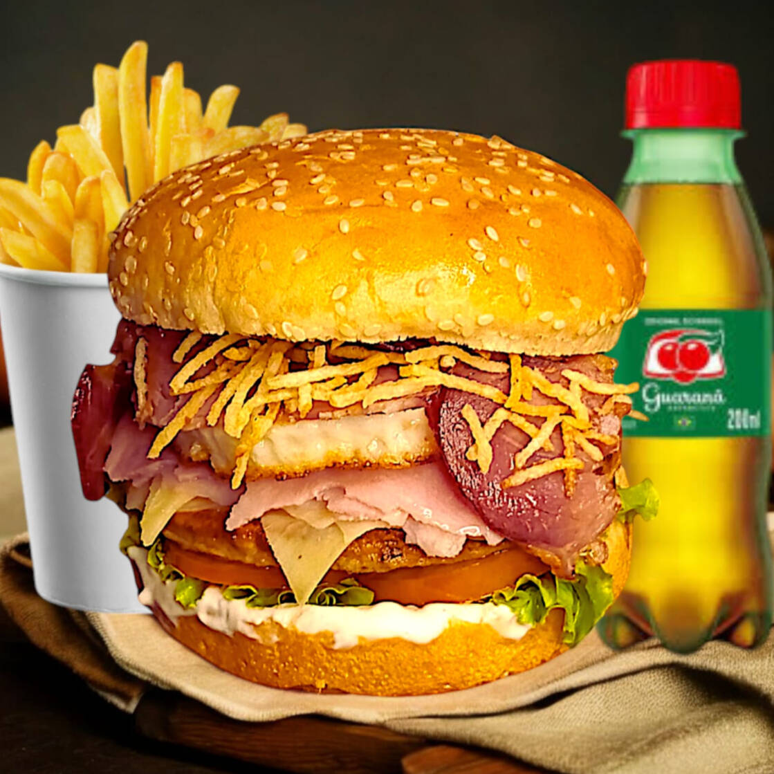 Delicioso hambúrguer de carne bovina, queijo muçarela, presunto, calabresa, batata palha, alface, tomate, molho de alho da casa + Batata Frita + Refrigerante.