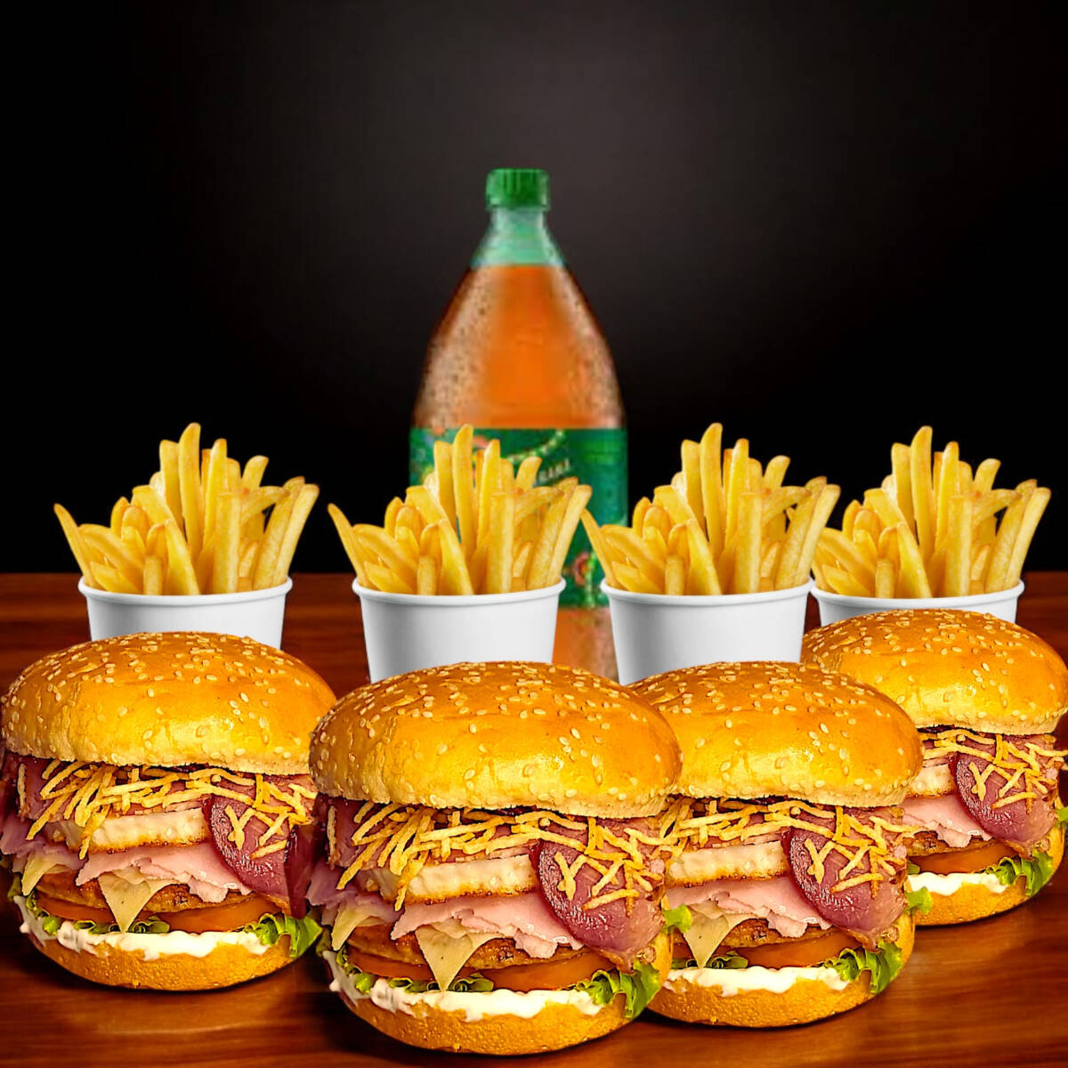 Apresentando o Combo Família Clássico da casa: 4 saboroso lanches preparado com pão macio, alface fresca, tomate suculento, bife bovino, queijo muçarela, presunto, ovo, bacon defumado, batata palha crocante e nossa irresistível maionese de alho, acompanhado por quatro porções de batata frita e um refrigerante Kuat de 2 litros de brinde. Uma verdadeira festa de sabores para aproveitar com amigos e família!