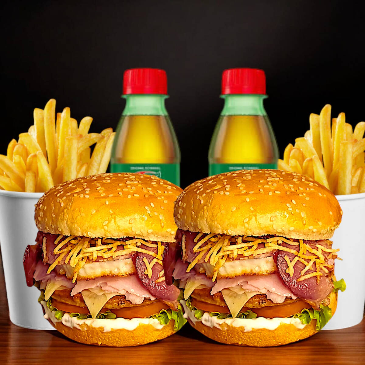 Apresentando o Combo Casal: Dois deliciosos lanches recheados com pão macio, alface fresca, tomate suculento, bife bovino, queijo muçarela, presunto, ovo, bacon defumado, batata palha crocante e nossa especial maionese de alho, acompanhados por duas porções de batata frita crocante e dois refrigerantes gelados. Uma experiência de sabor para compartilhar com quem você ama!