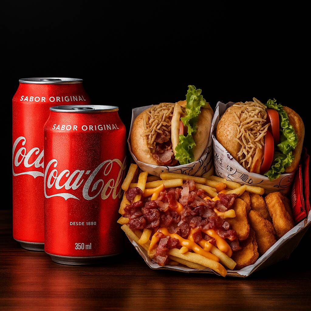 Lanche + Fritas + Coca- cola lata Lanche composto: Pão macio, alface e tomate selecionados e frescos, 2(dois) bifes bovinos, 2(duas) fatias de muçarela, 2(duas) fatias de presunto, ovo, fatias de bacon, salsicha, milho, batata palha, maionese de alho feito pela casa. (molho é opcional)