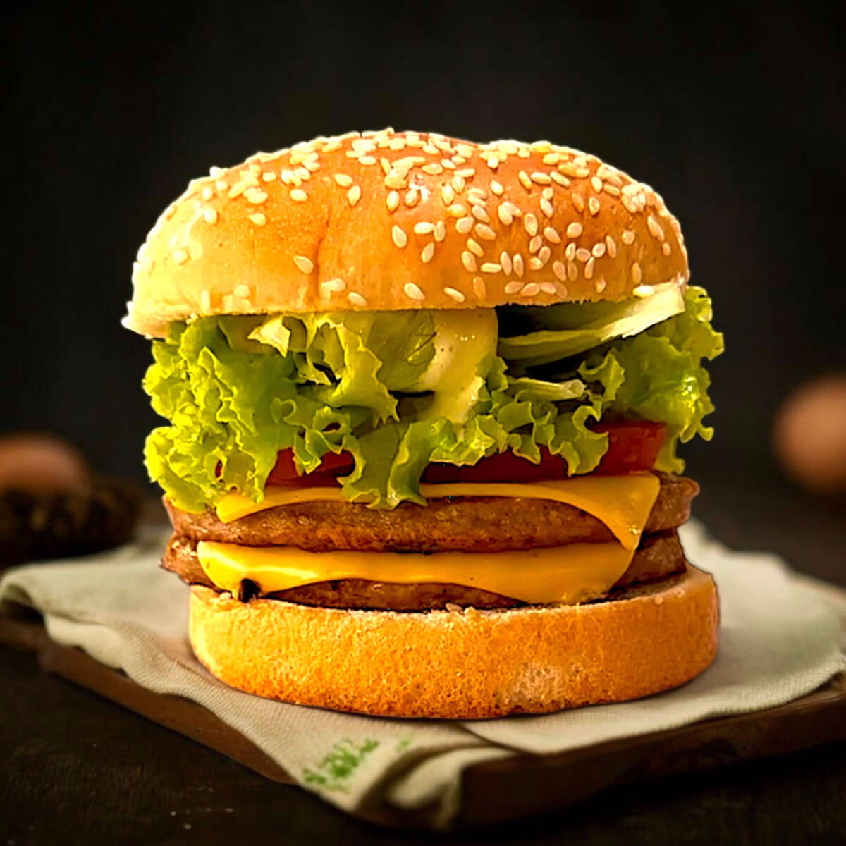 O dobro de tudo: Cheddar derretido, dois bifes grelhados, alface, tomate e a maionese de alho da casa. Uma explosão de sabor que você precisa experimentar!