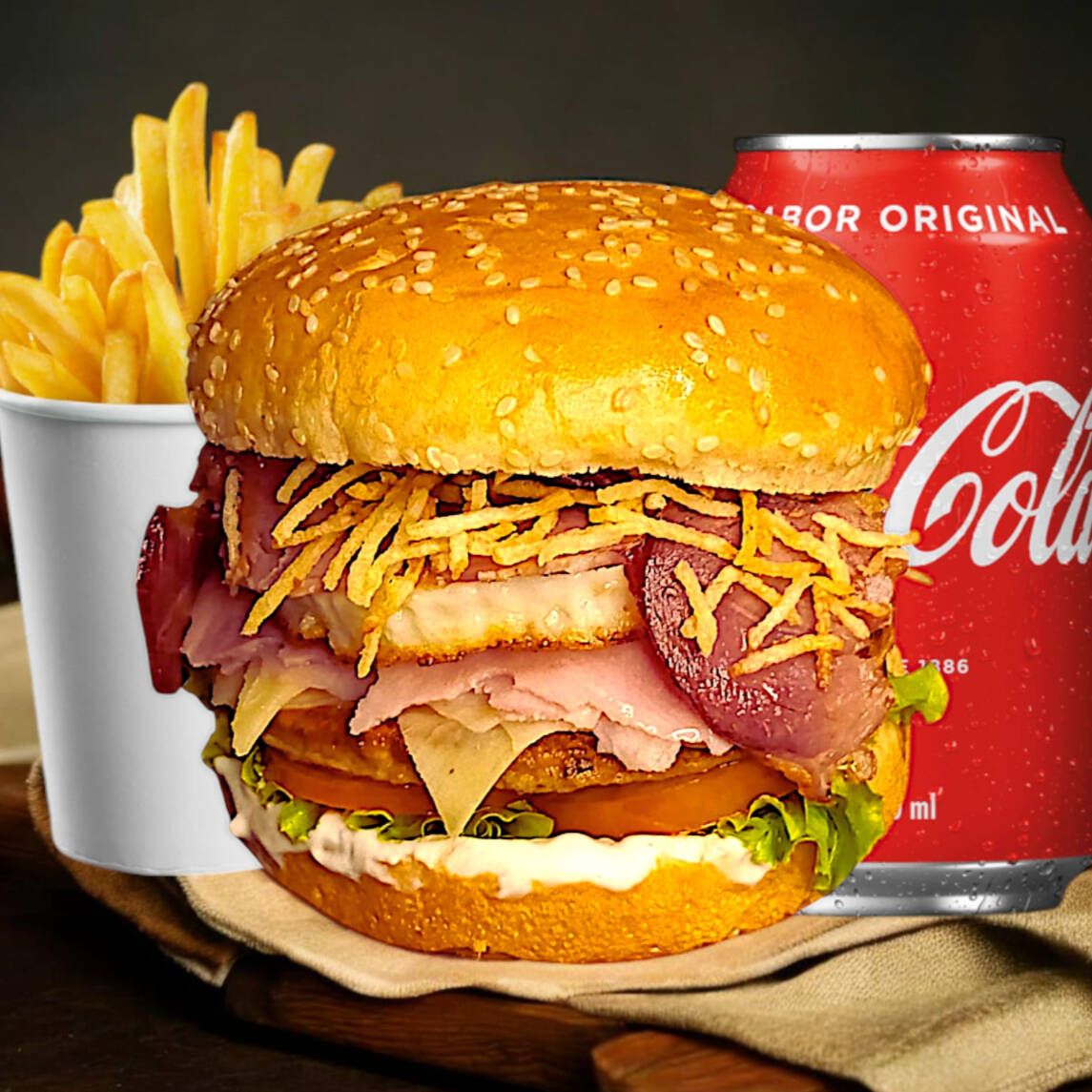 Pão macio, alface, tomate, bife bovino, muçarela, presunto, ovo, 2 (duas) vezes mais bacon defumado, maionese de alho (preparo da casa) + uma porção generosa de batata frita + Coca-Cola Lata