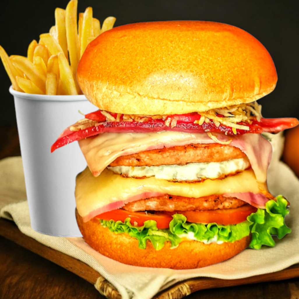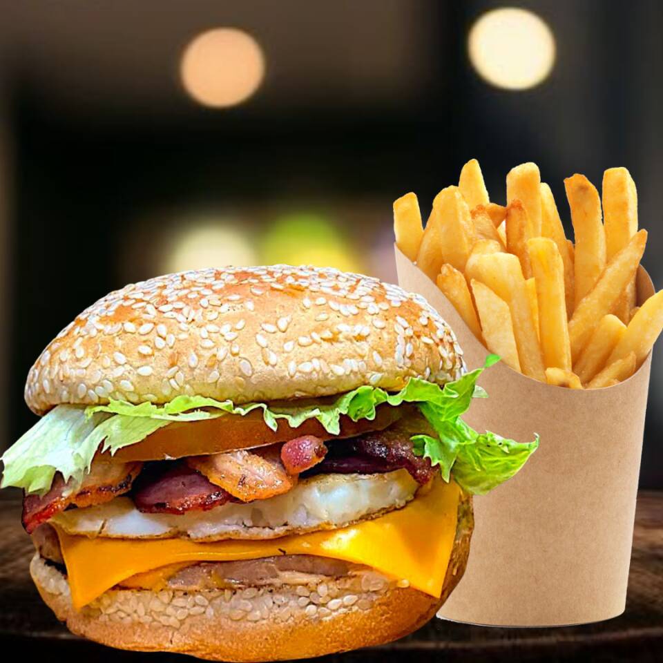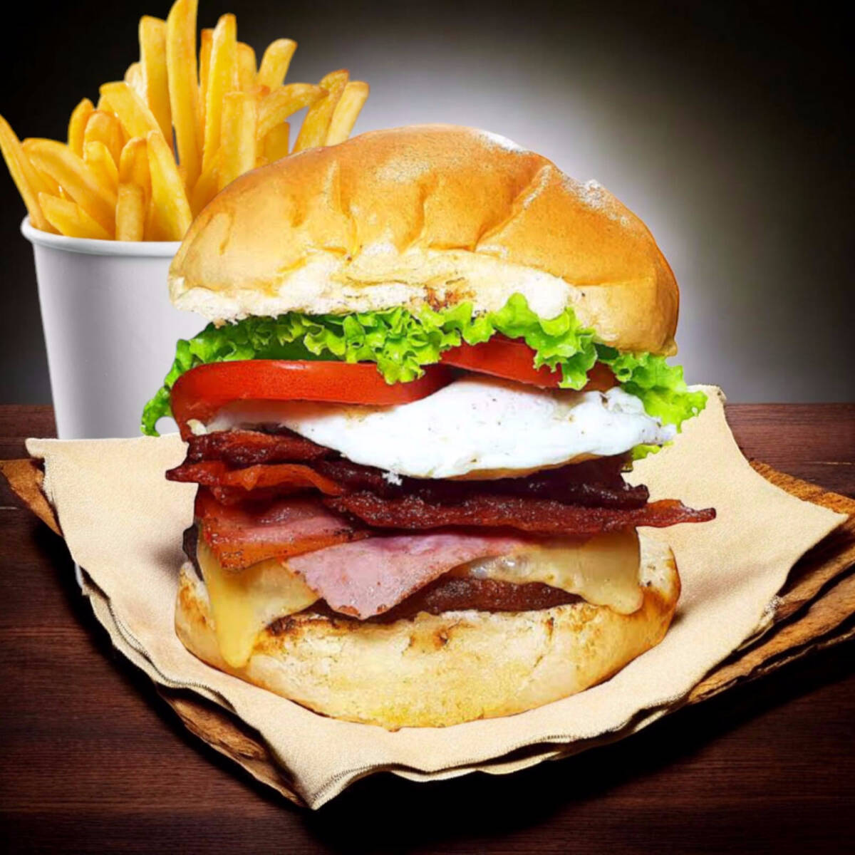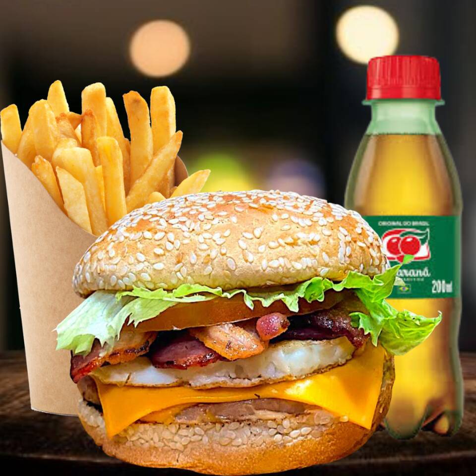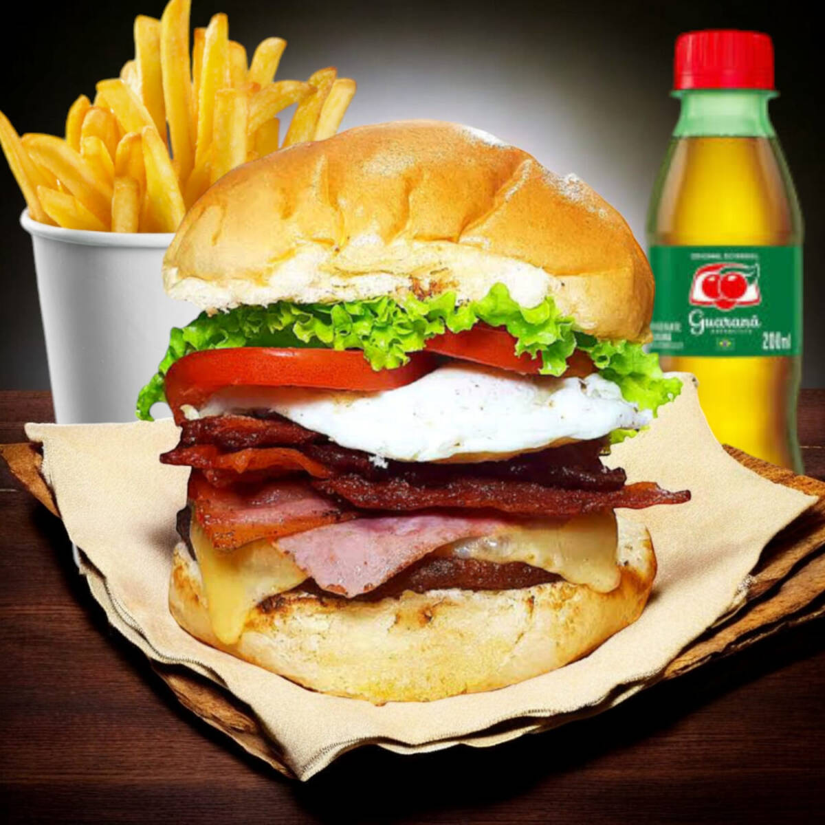 Pão macio, salada fresquinha, nossa famosa maionese de alho , bife bovino, queijo cheddar derretendo, ovo no capricho e bacon crocante +Fritas + Refrigerante.