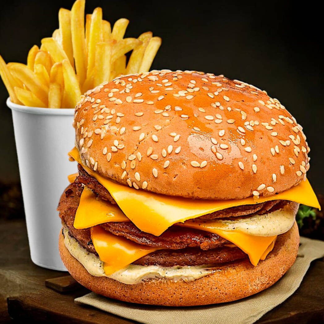 O dobro de tudo: Cheddar derretido, dois bifes grelhados, alface, tomate e o molho de cheddar Metl. Uma explosão de sabor que você precisa experimentar + uma porção generosa de Fritas