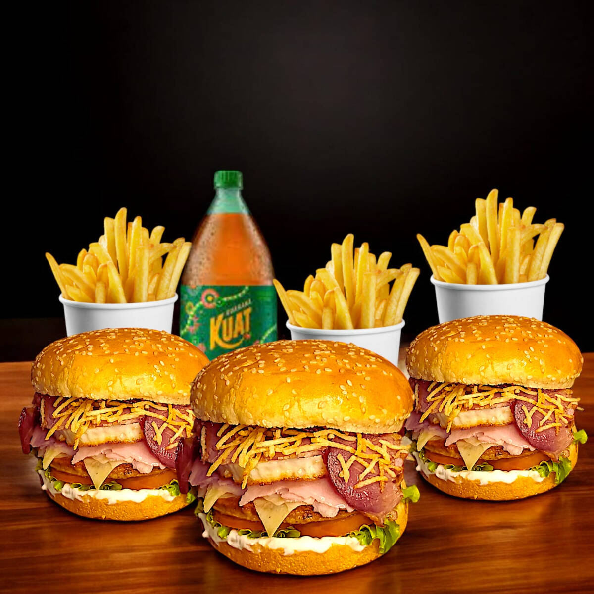 Apresentando o Combo Especial: Três saboroso lanche preparado com pão macio, alface fresca, tomate suculento, bife bovino, queijo muçarela, presunto, ovo, bacon defumado, batata palha crocante e nossa irresistível maionese de alho, acompanhado por três porções de batata frita e um refrigerante Kuat de 2 litros. Uma verdadeira festa de sabores para aproveitar com amigos e família!