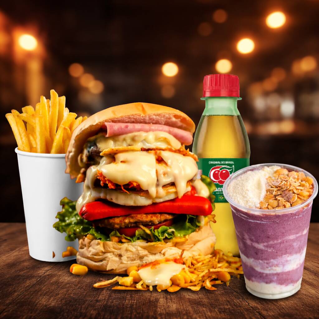 Lanche + Fritas + refrigerante + Açai de 300ml Açai, leite condensado, leite em pó, granola, paçoca. Lanche composto: Pão macio, alface e tomate selecionados e frescos, 2(dois) bifes bovinos, 2(duas) fatias de muçarela, 2(duas) fatias de presunto, ovo, fatias de bacon, salsicha, milho, batata palha, maionese de alho feito pela casa. (molho é opcional)