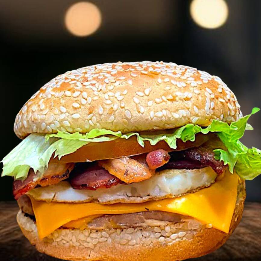 Apresentamos o Clássico da Casa: um hambúrguer de dar água na boca, com hambúrguer suculento, queijo derretido, presunto, ovo, bacon, batata palha, alface, tomate e nossa irresistível maionese de alho.