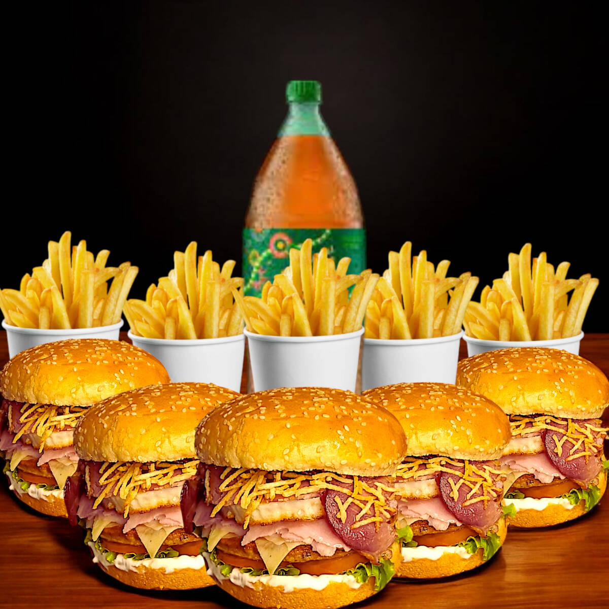 Apresentando o Combo Especial: Cinco saboroso lanche preparado com pão macio, alface fresca, tomate suculento, bife bovino, queijo muçarela, presunto, ovo, bacon defumado, batata palha crocante e nossa irresistível maionese de alho, acompanhado por cinco porções de batata frita e um refrigerante Kuat de 2 litros de brinde. Uma verdadeira festa de sabores para aproveitar com amigos e família!