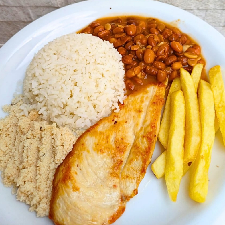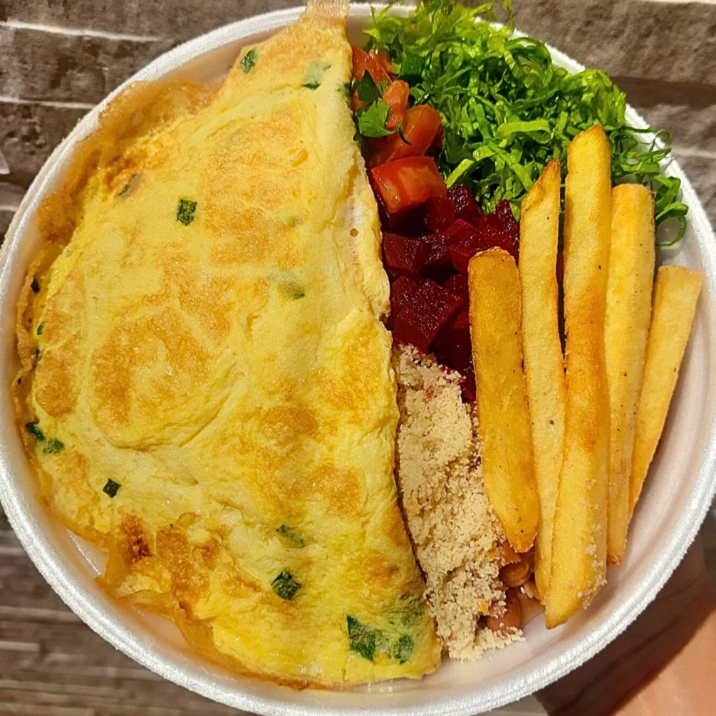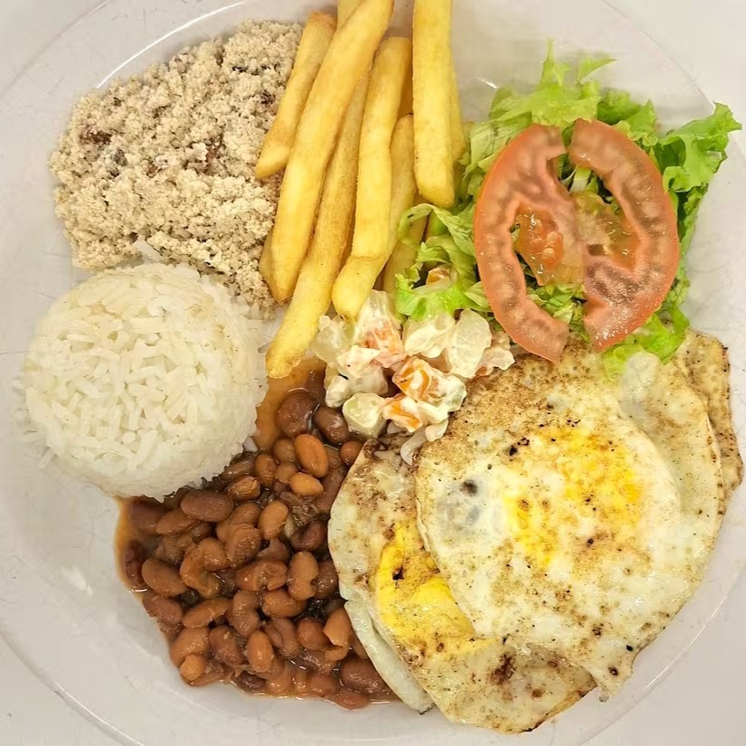 Marmita com 500g. Arroz, Feijão, Farofa, batata frita e ovos fritos